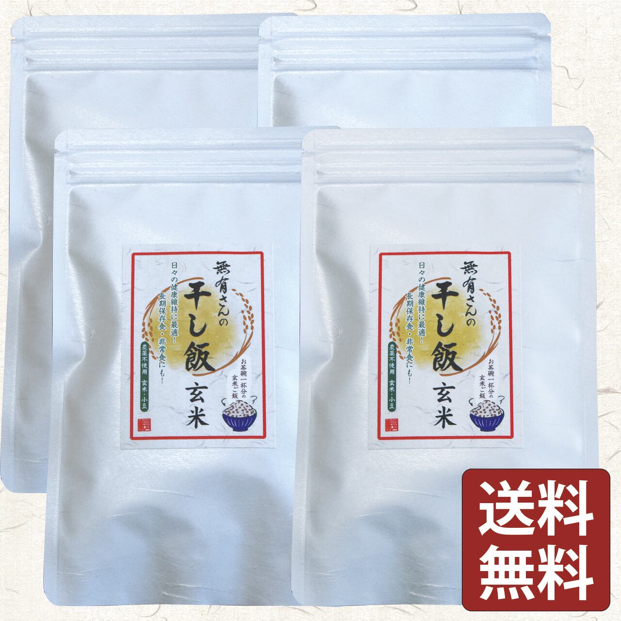 非常食としてもローリングストックでき、栄養豊富な長期備蓄食としても優れている「無有さんの干し飯 玄米」100gを4袋セットにしました。